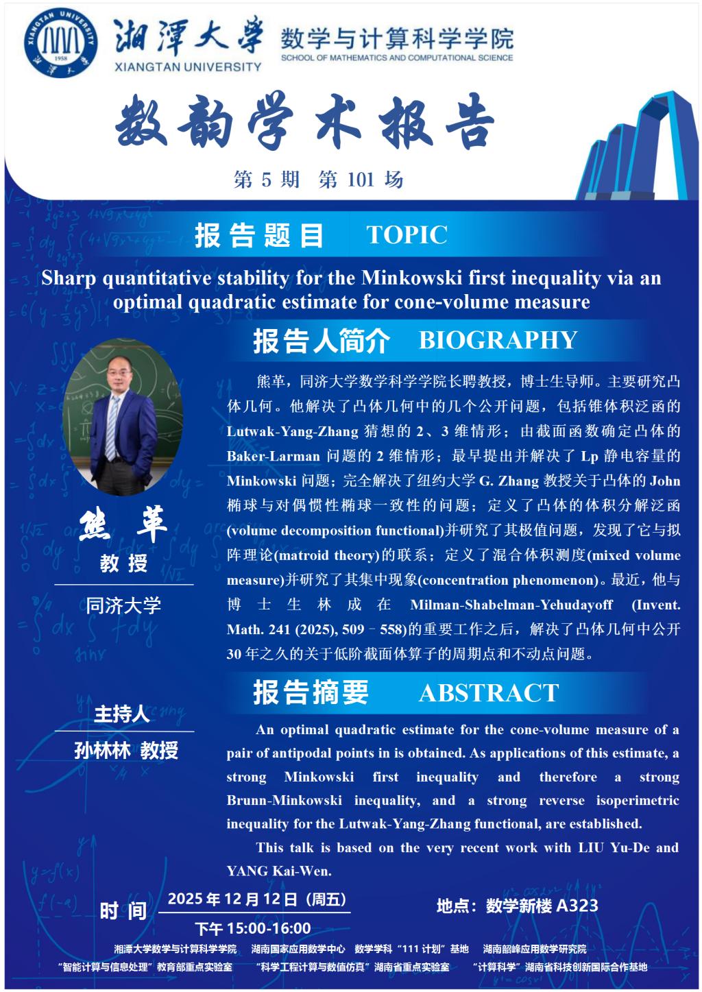 数韵学术报告-Sharp quantitative stability for the Minkowski first inequality via an optimal quadratic estimate for cone-volume measure
