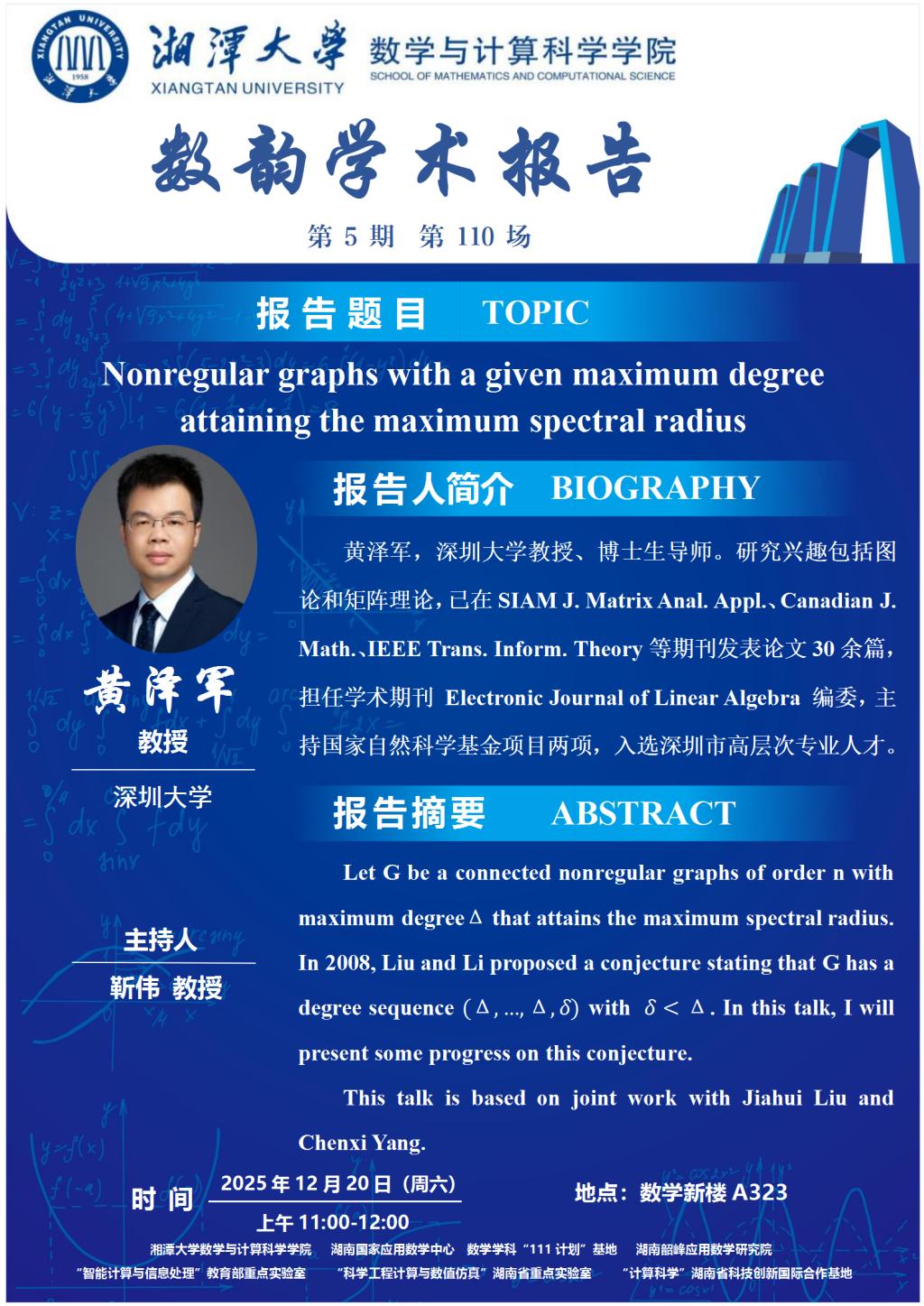 数韵学术报告-黄泽军-Nonregular graphs with a given maximum degree attaining the maximum spectral radius