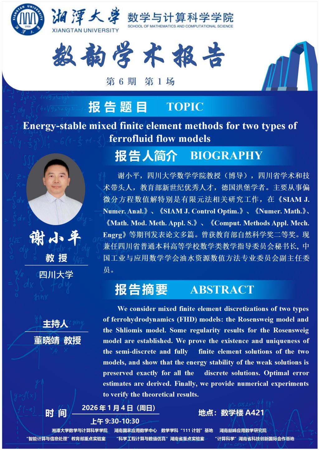 数韵学术报告-谢小平-Energy-stable mixed finite element methods for two types of ferrofluid flow models