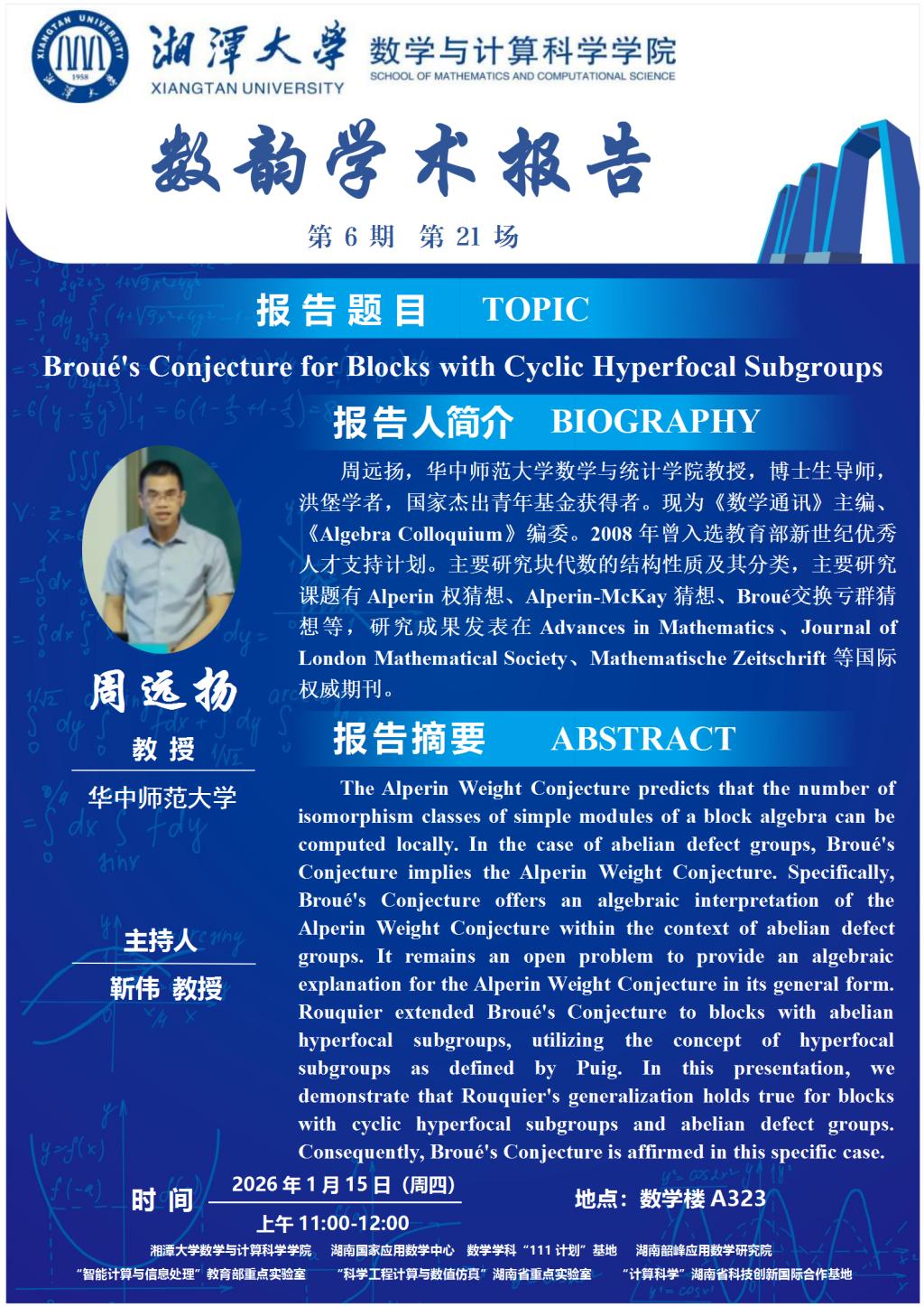 数韵学术报告-周远扬-Broué's Conjecture for Blocks with Cyclic Hyperfocal Subgroups