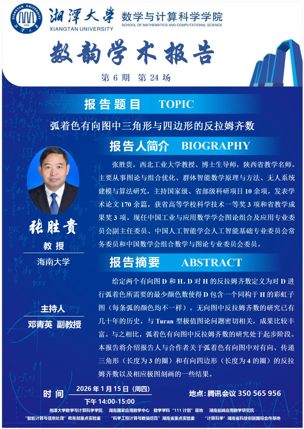 数韵学术报告-张胜贵-弧着色有向图中三角形与四边形的反拉姆齐数